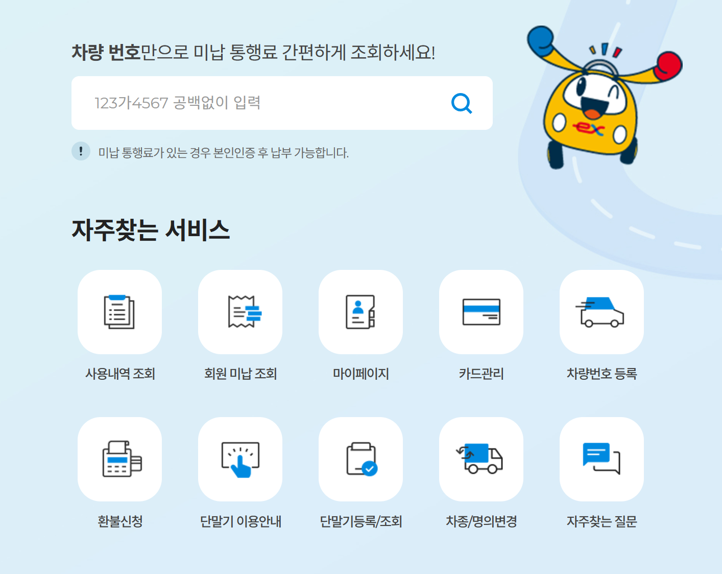 - 차량 정보 등록: 한국도로공사 홈페이지(www.ex.co.kr) 또는 '고속도로통행료' 앱에서 차량 정보를 등록합니다. 이때, 차량 번호와 본인 인증이 필요합니다.