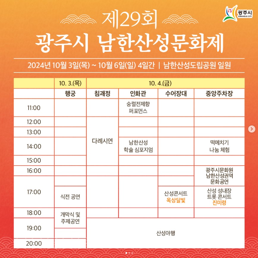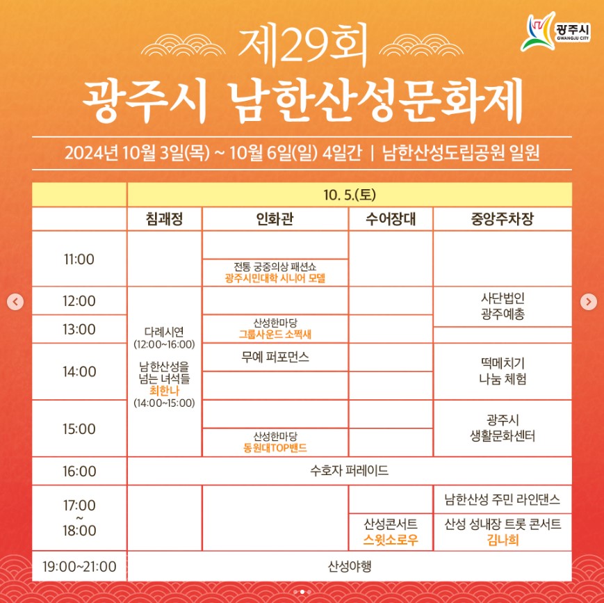 올해 제29회 남한산성문화제는 2024년 10월 3일부터 6일까지 진행됩니다. 매일 다양한 프로그램이 준비되어 있으며, 특히 10월 5일에는 퍼레이드와 같은 특별한 이벤트가 예정되어 있습니다. 퍼레이드는 오후 4시부터 중앙주차장에서 시작하여 한남루까지 이어지는 코스로 진행됩니다. 이 외에도 다양한 공연과 체험 프로그램이 마련되어 있어 가족 단위 방문객들에게도 적합한 행사입니다.