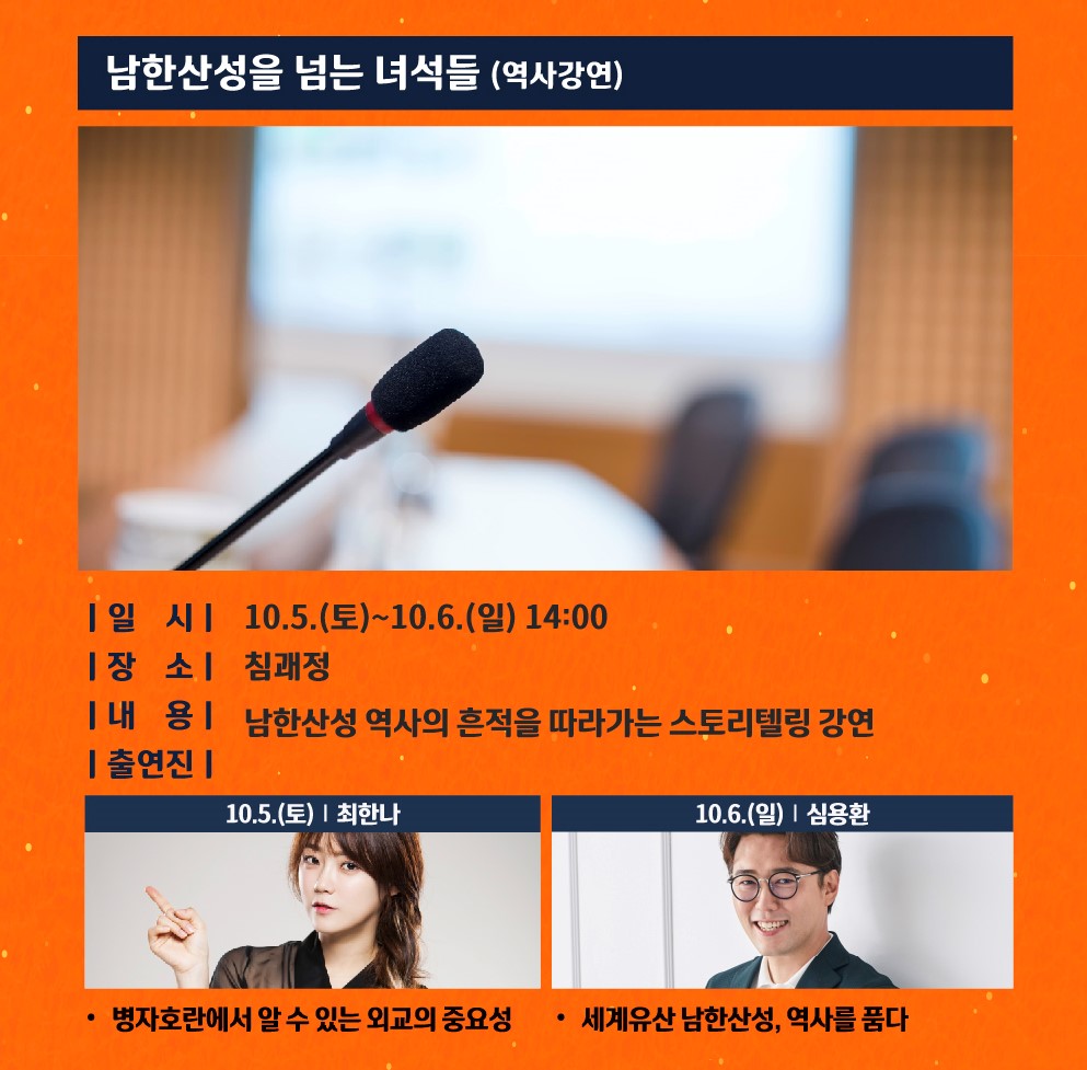 - 역사 강연 : 남한산성의 역사와 관련된 강연이 진행되어 역사에 관심이 많은 분들에게 좋은 기회가 될 것입니다.
