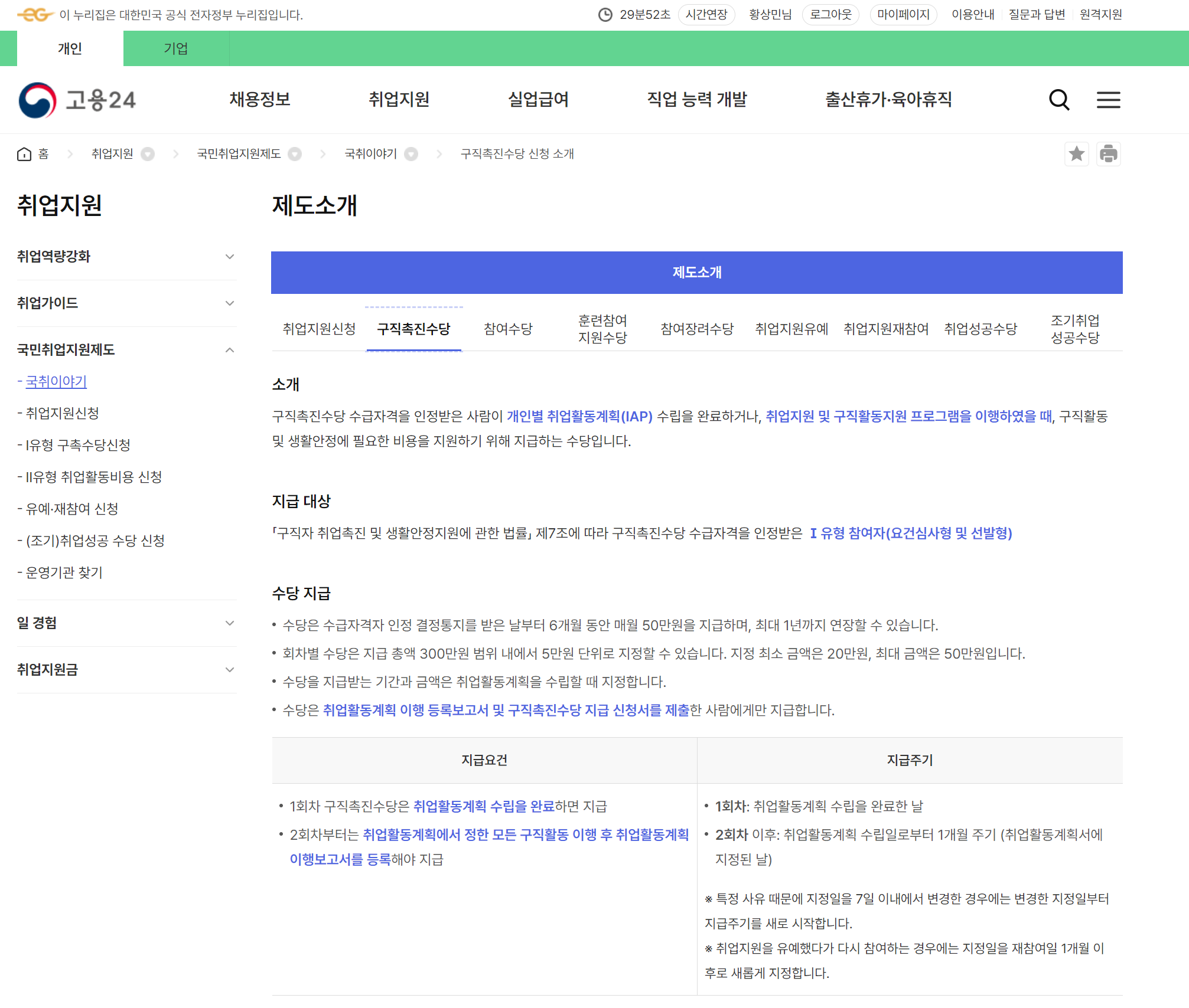 • 구직자로 선정되면 최대 300만 원(월 50만 원씩 6개월)을 구직촉진수당으로 지급받을 수 있습니다.