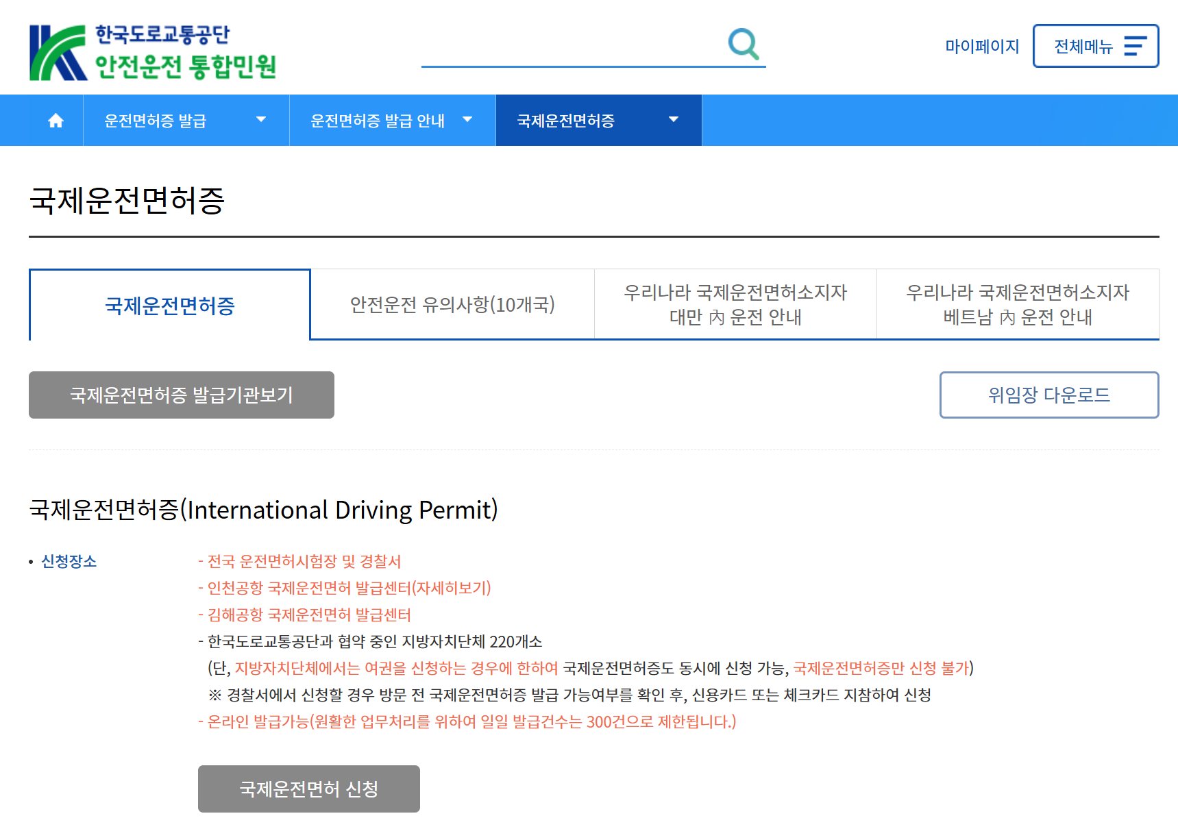 - '국제운전면허증 발급 신청' 메뉴 선택