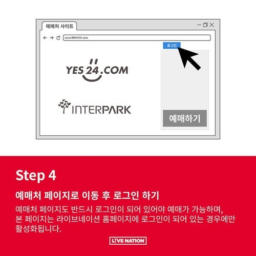 - 예매처로 이동후 로그인 : 예매처 페이지에 미리 로그인이 되어있어야 예매가 가능하고 라이브네이션 홈페이지에 로그인이 되어야만 활성화가 됩니다.
