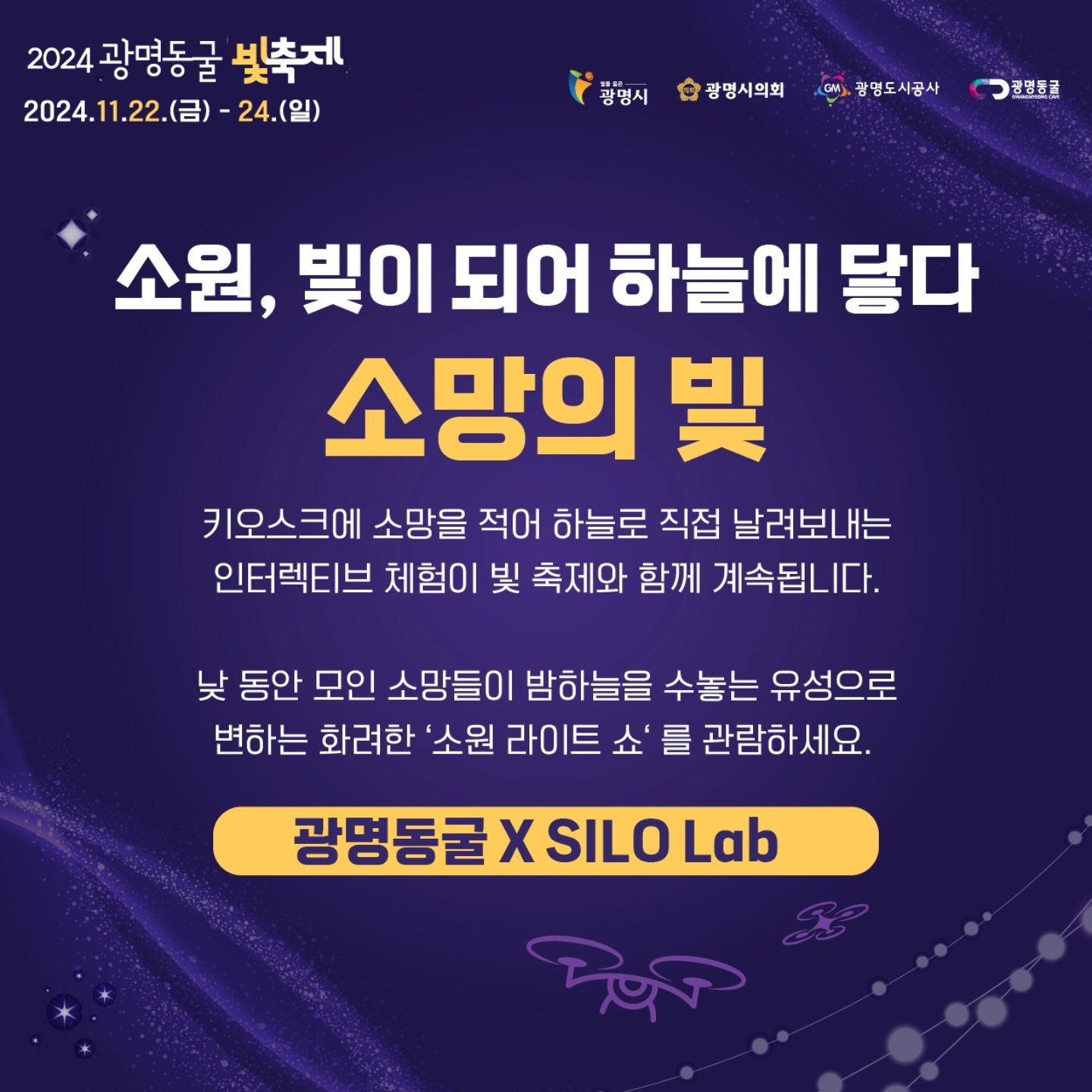 '2024 광명동굴 빛축제'는 화려한 드론쇼와 빛 퍼포먼스로 이루어진 환상적인 축제로, 이외에도 다양한 프로그램과 이벤트가 준비되어 있습니다. 그중에서도 가장 주목할 만한 프로그램은 다음과 같습니다.