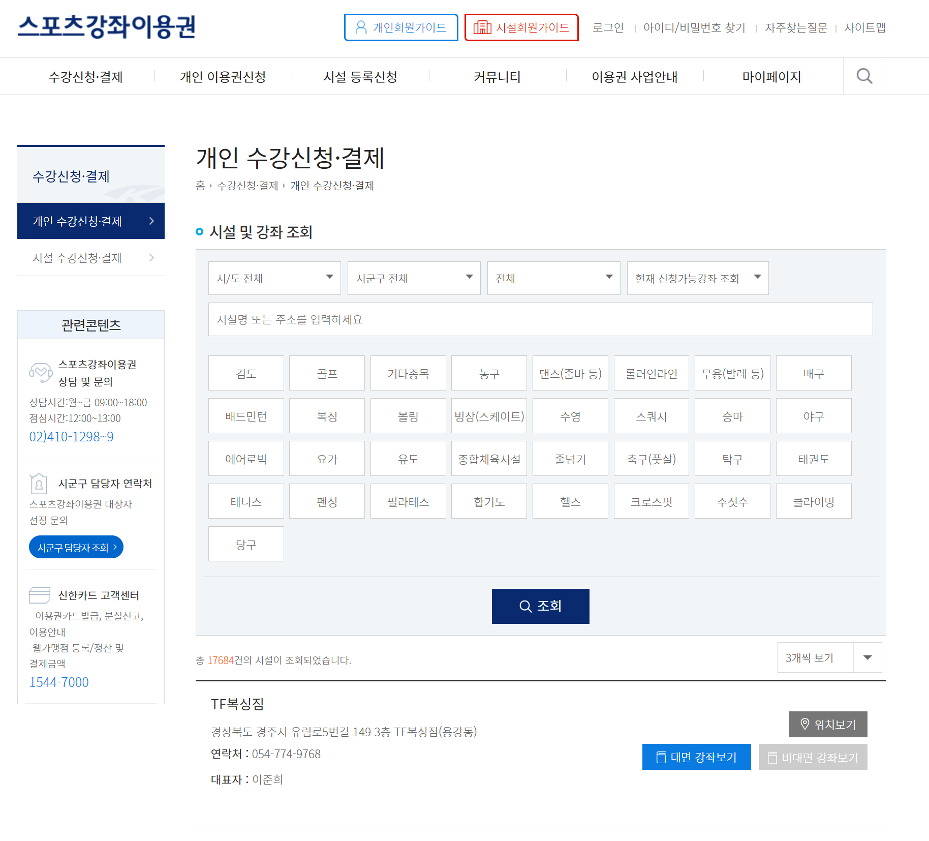 최종 결재는 스포츠바우처 가능 카드로 이루어지며 카드는 온라인으로 직접 신청하거나 유선으로 신청하시면 됩니다.