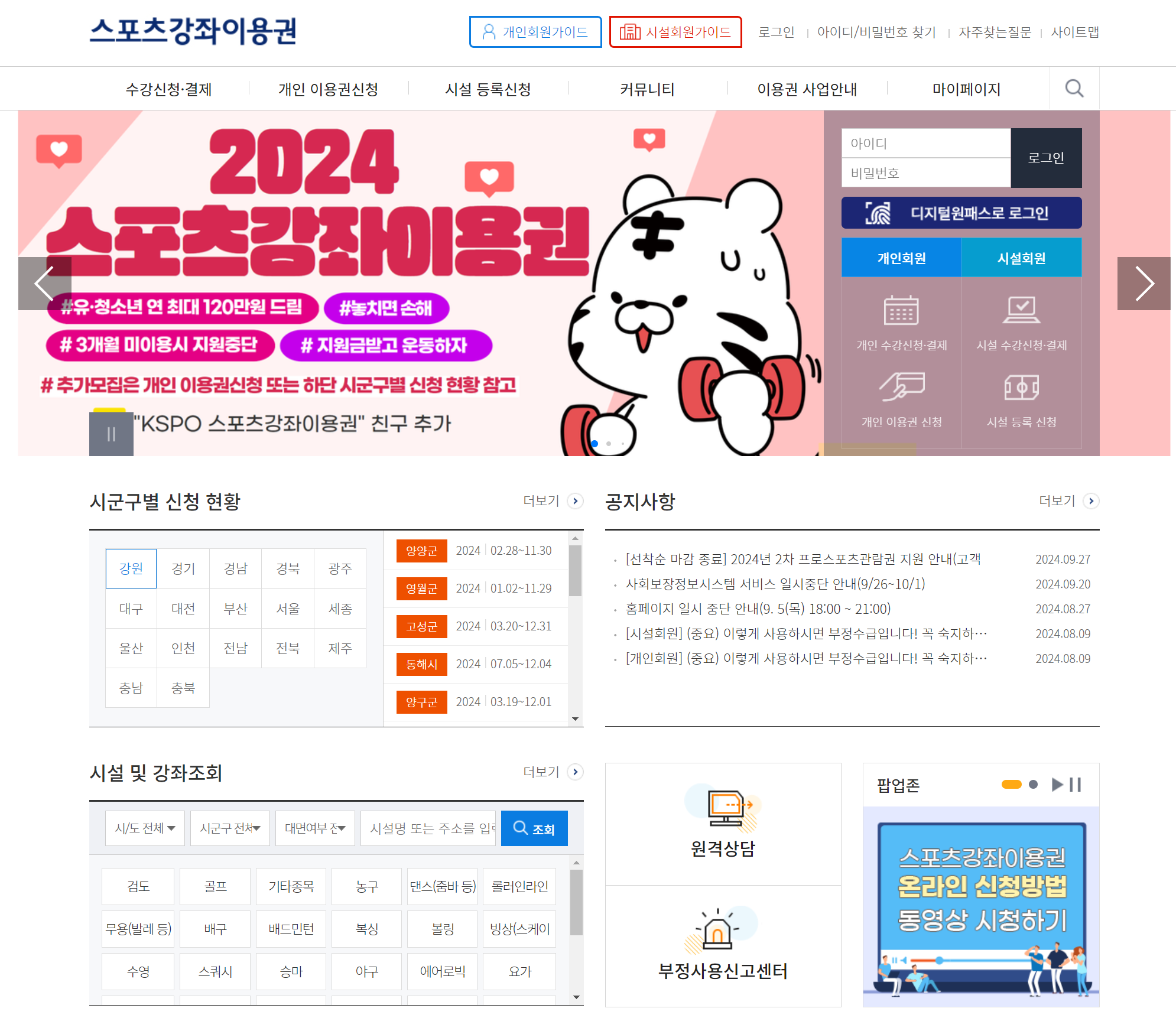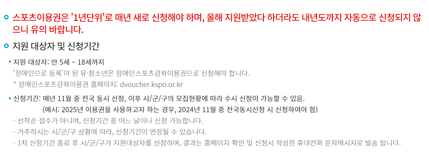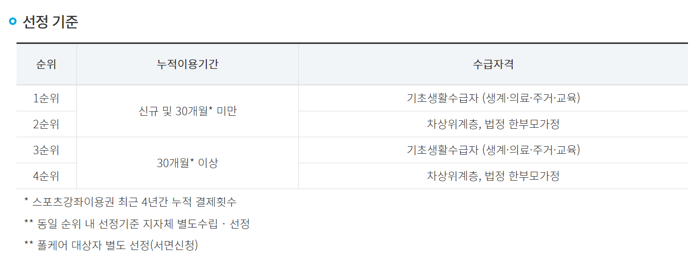 - 온라인 신청 : 스포츠이용권 강좌 홈페이지를 통해 신청할 수 있습니다.