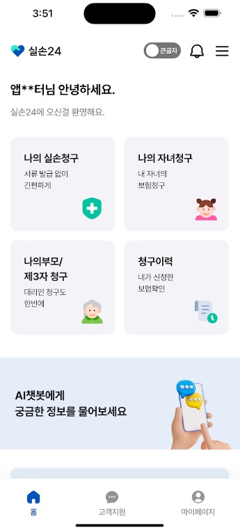 이제 언제 어디서나 실손보험 청구를 할 수 있습니다.