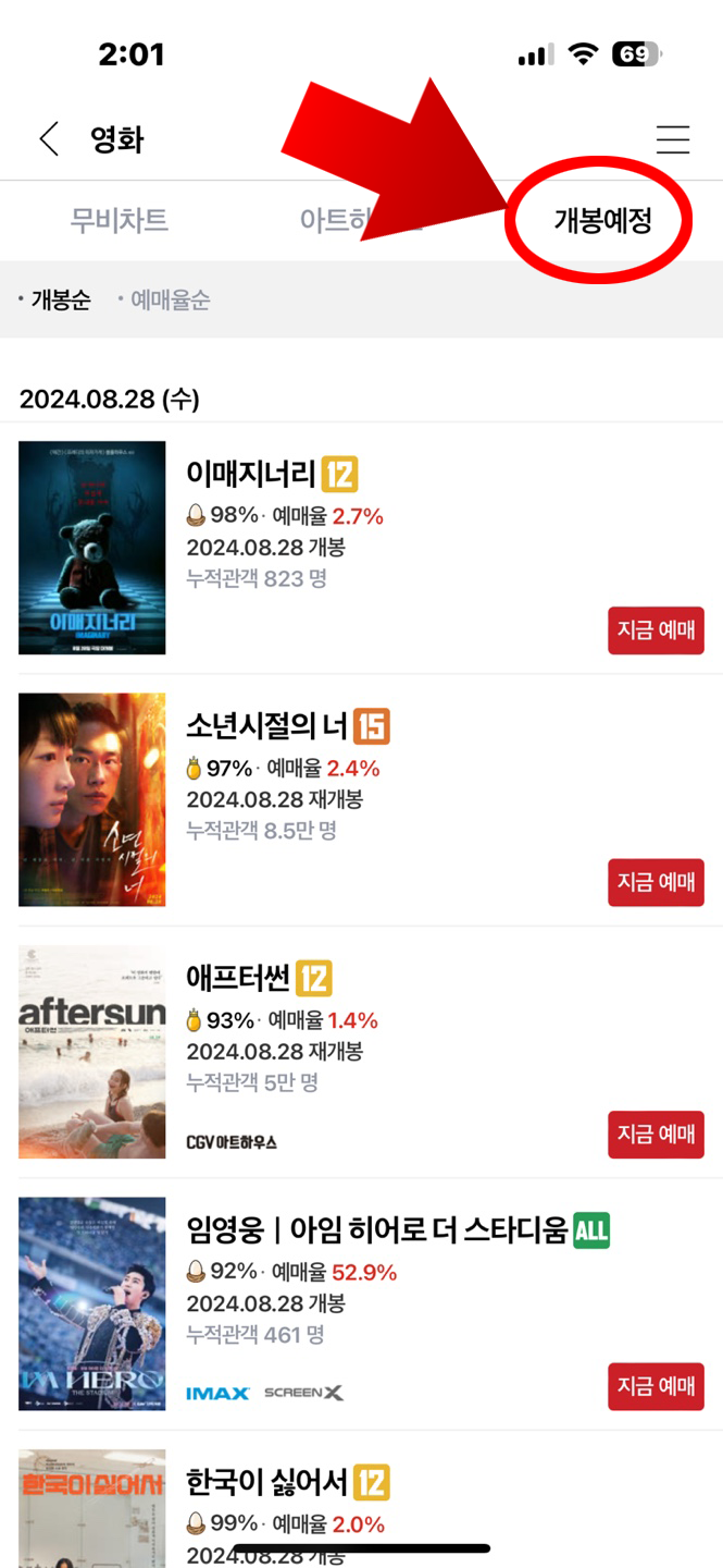 - 각 영화관 어플 및 홈페이지에서 예매가능 (CGV, 롯데시네마, 메가박스)