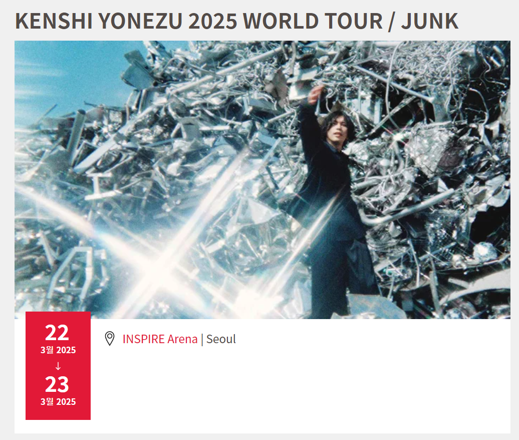 요네즈 켄시의 공연은 서울에 위치한 인스파이어 아레나에서 열립니다. 공연 일정은 다음과 같습니다.