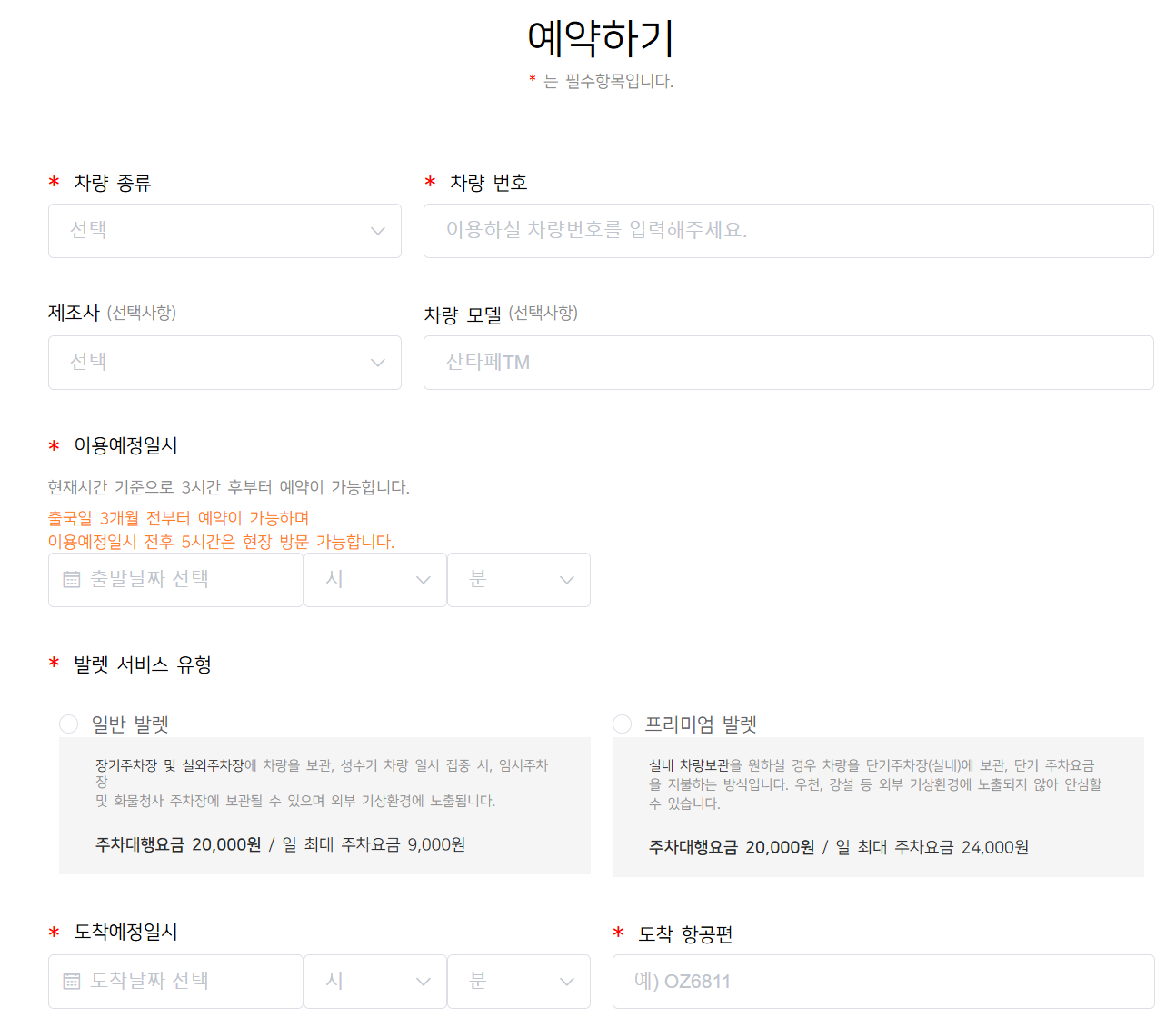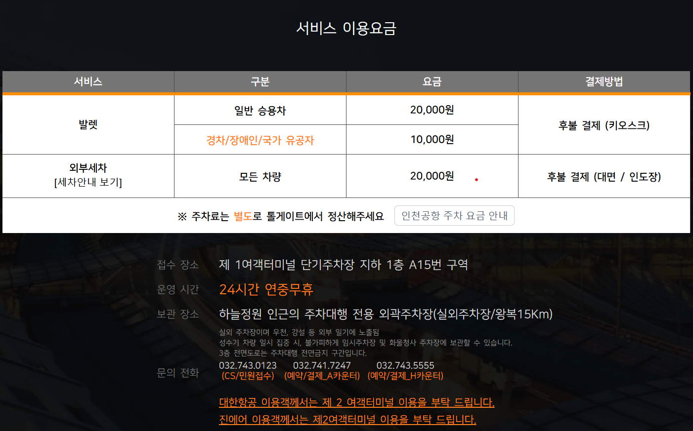 주의: 주차대행 서비스 요금 외에 별도의 주차 요금(장기주차 요금 적용)이 부과됩니다. 두 요금 모두 서비스 이용 후 정산됩니다.