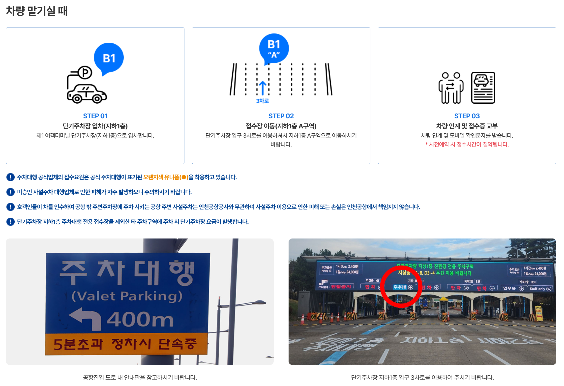 주의: 비공식 주차대행 서비스나 공항 외부의 주차 서비스는 인천공항과 무관하며, 이로 인한 피해나 손실에 대해 공항은 책임지지 않습니다.