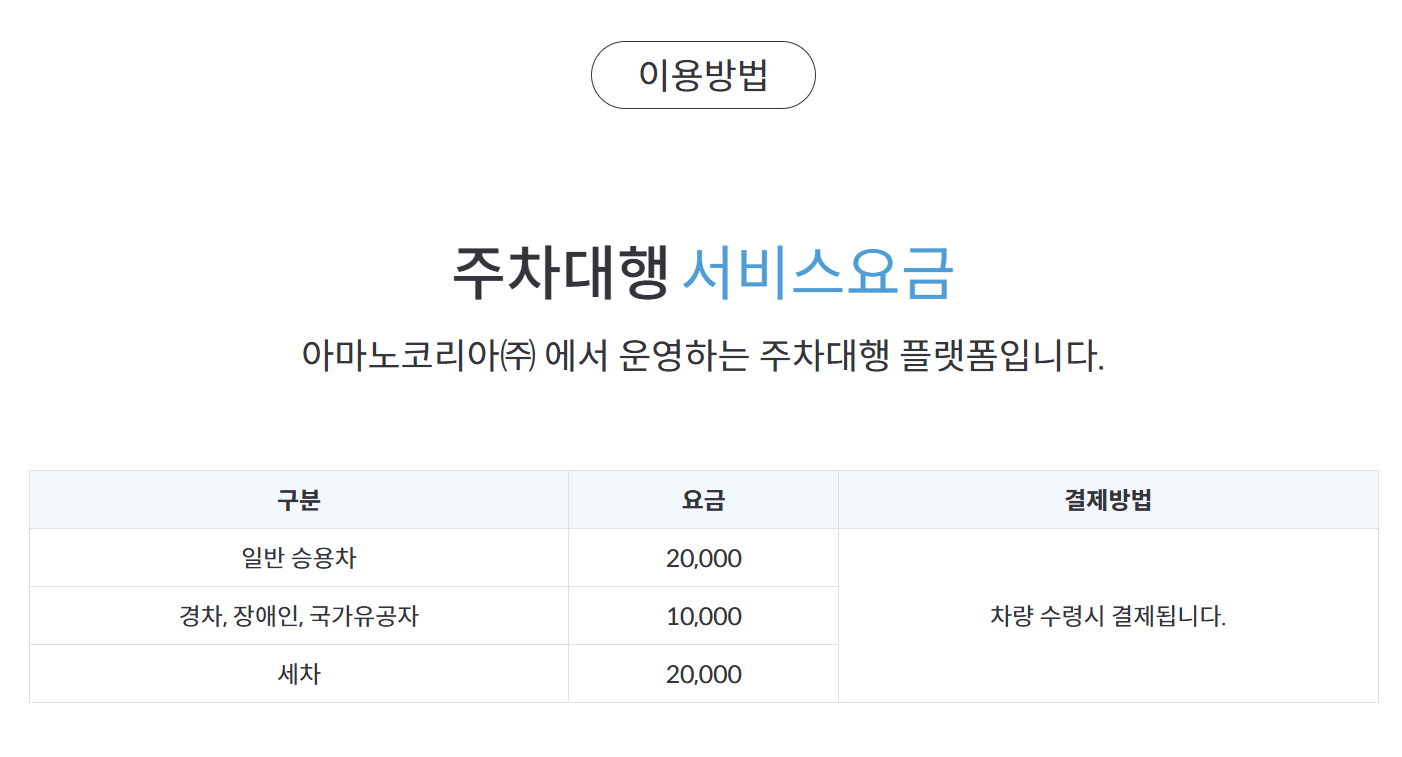 주의: 주차대행 서비스 요금 외에 별도의 주차 요금(장기주차 요금 적용)이 부과됩니다. 두 요금 모두 서비스 이용 후 정산됩니다.
