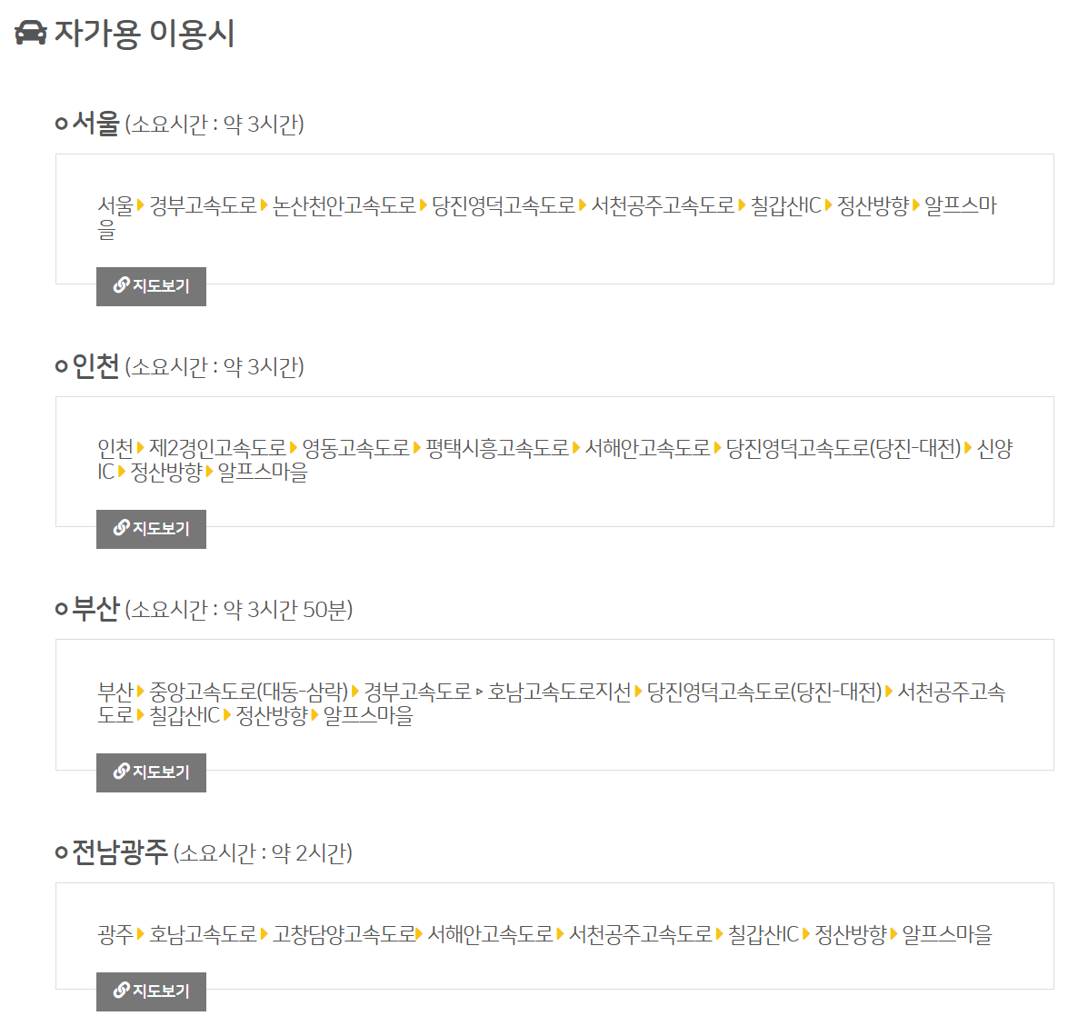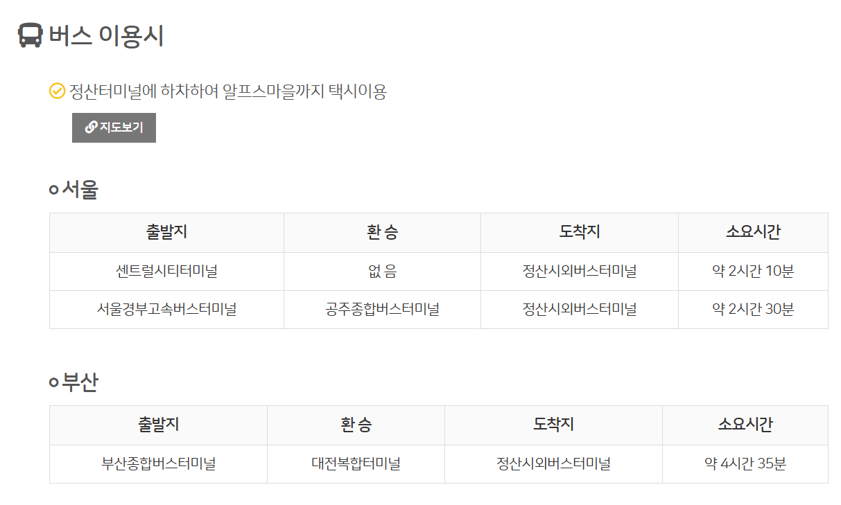 - 자가용 이용 시: 네비게이션에 '알프스마을' 또는 주소를 입력하시면 됩니다.