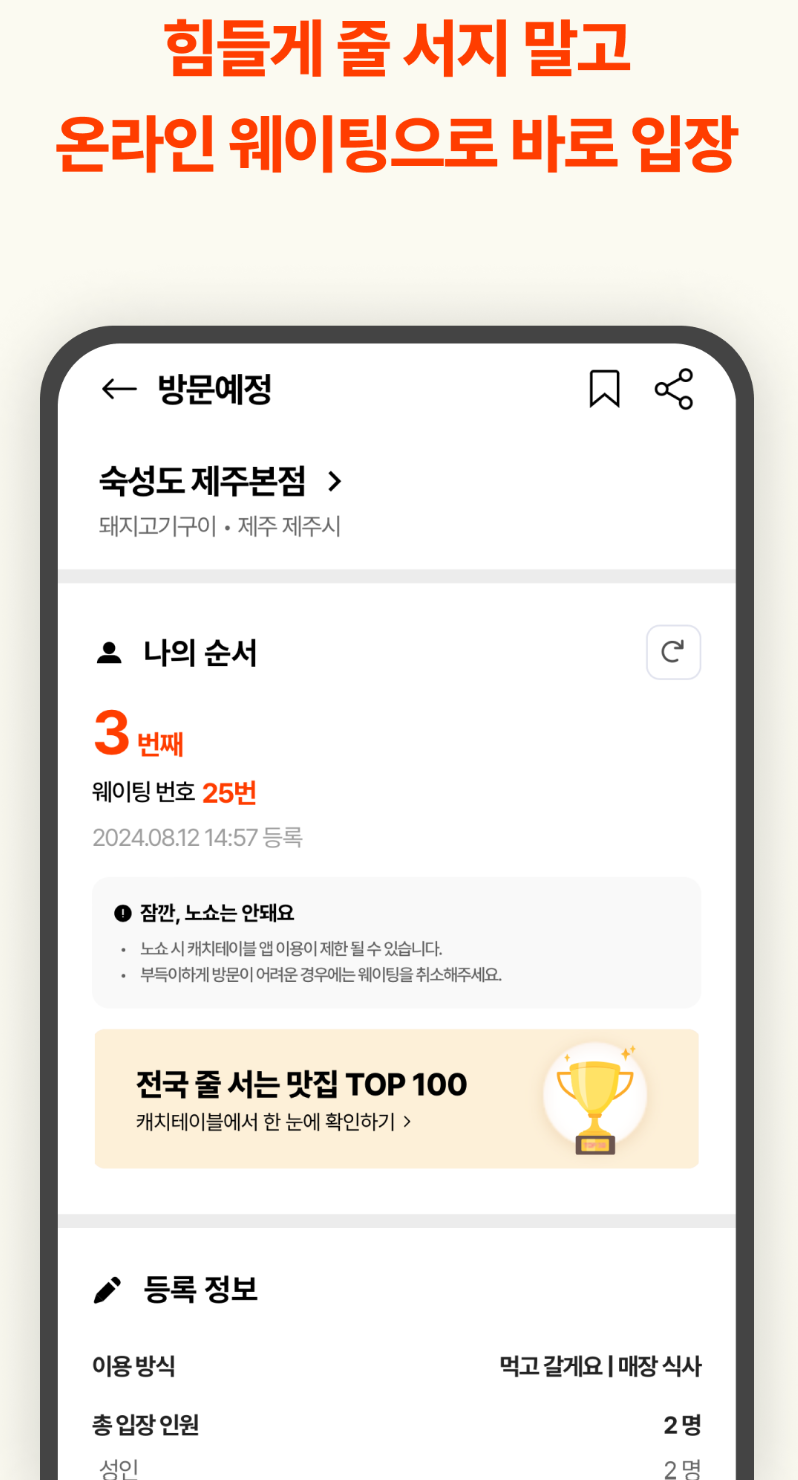 현재 웨이팅 정보가 실시간으로 업데이트되어, 대기 시간을 정확하게 알 수 있습니다.
