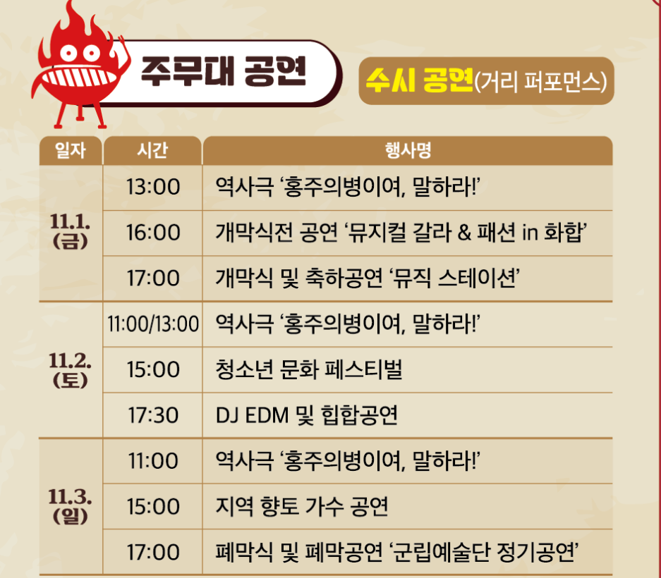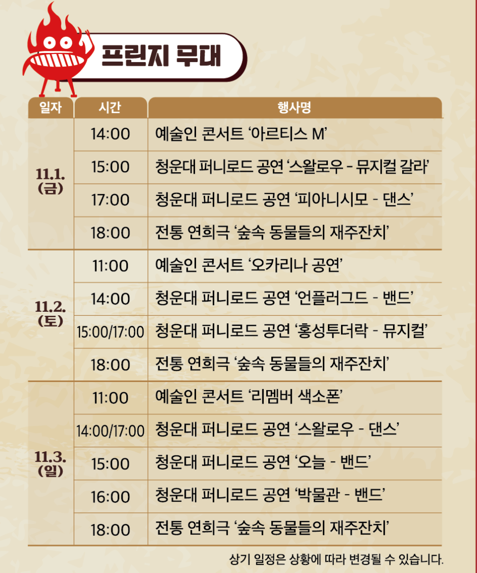 - 11월 1일(금): 개막식 및 축하공연, 전통 연희극