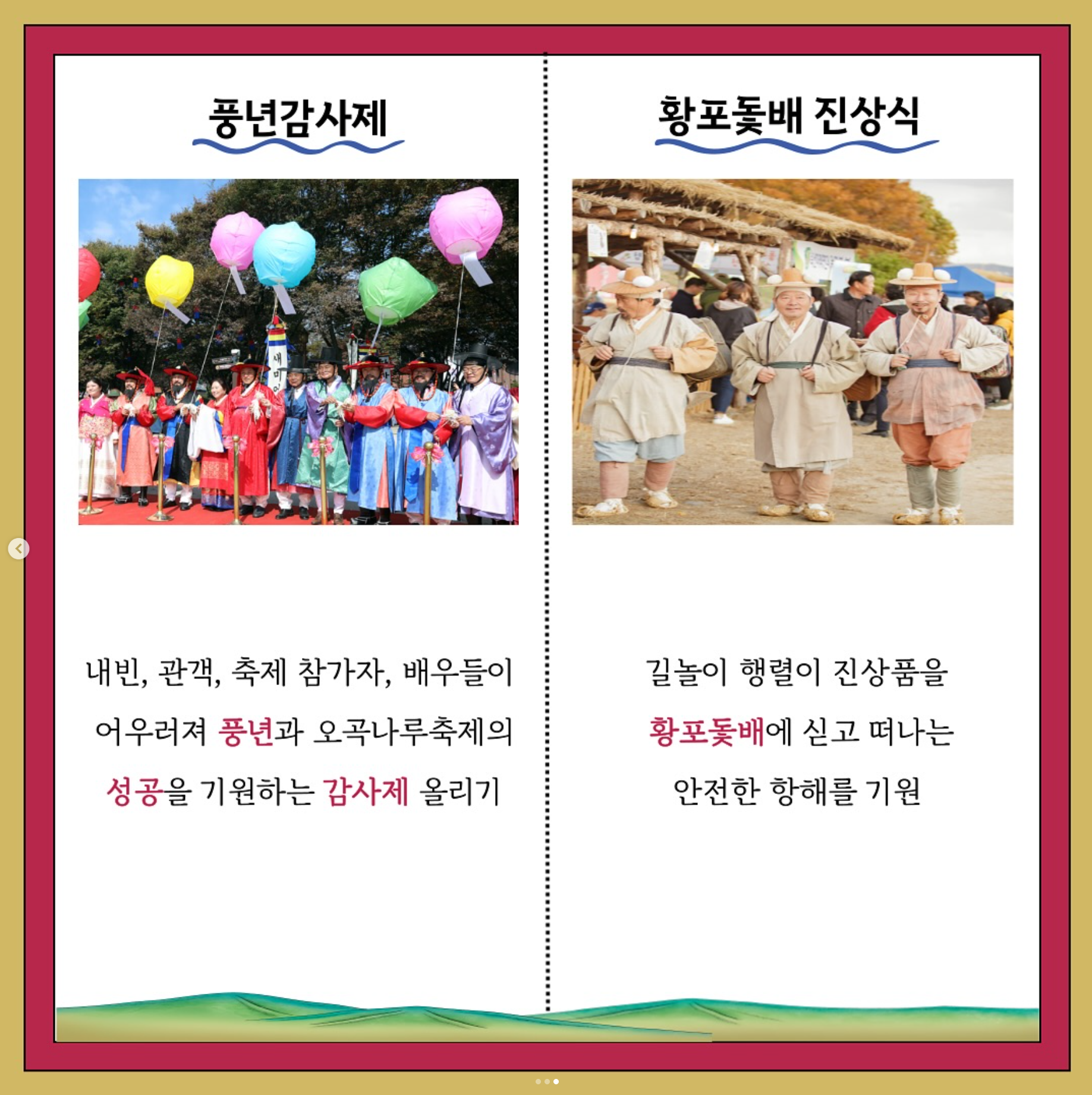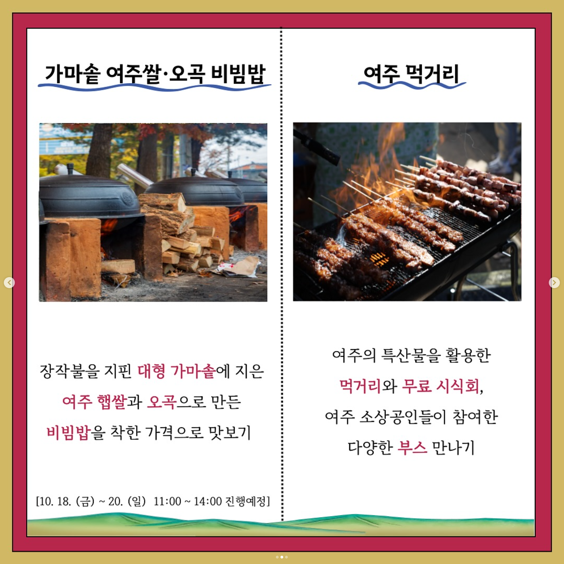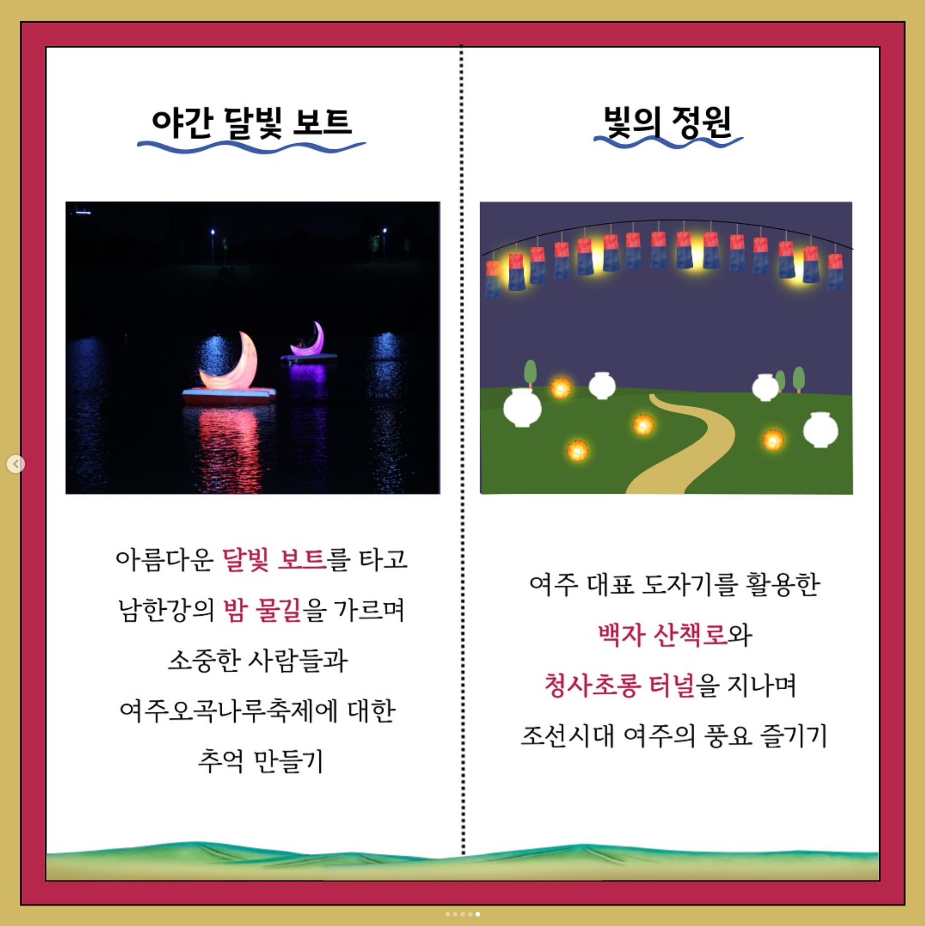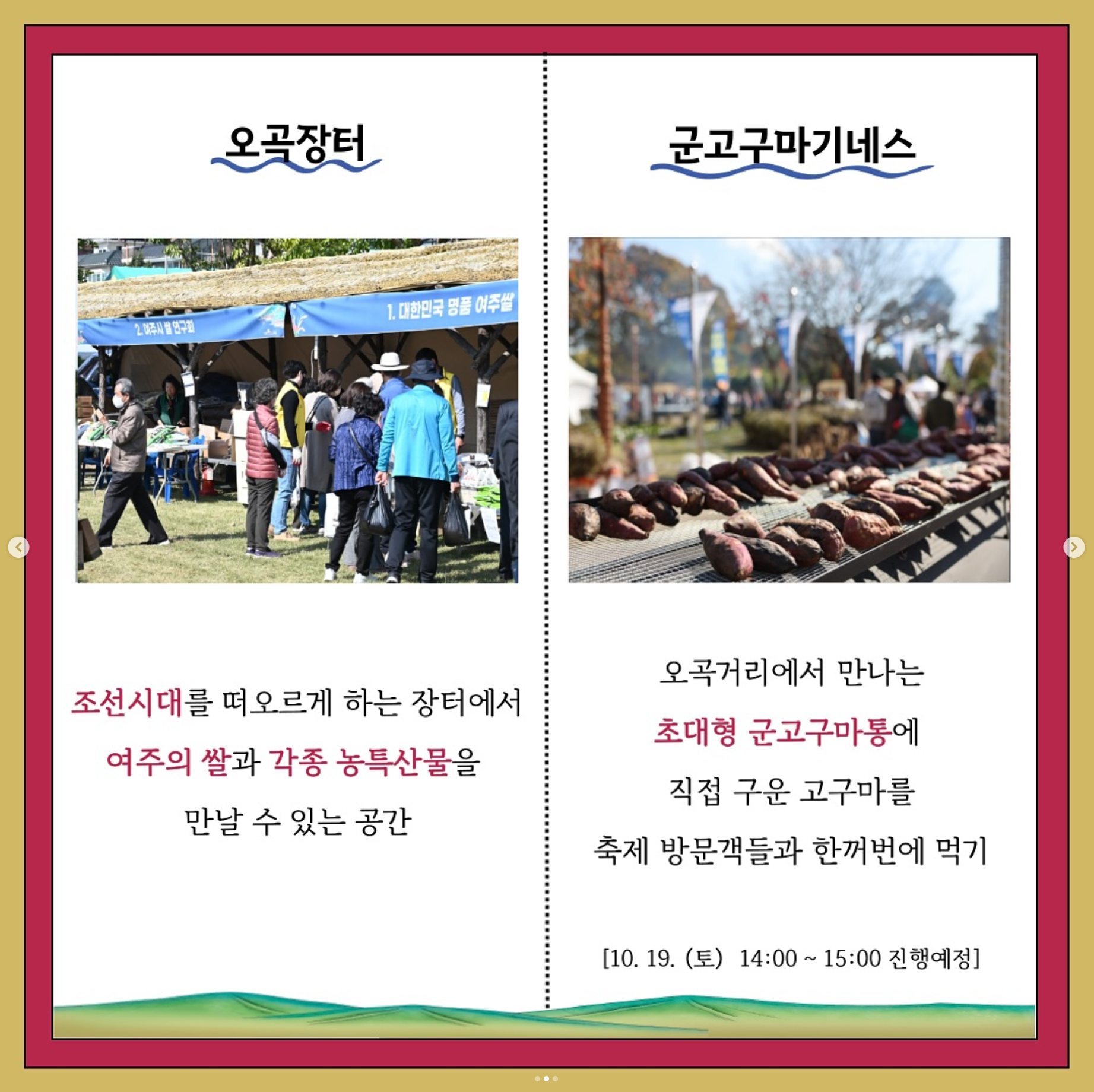올해에도 어김없이 여주 오곡나루 축제가 여러분을 기다리고 있습니다. 매년 많은 방문객들이 방문하는 선호도 높은 축제 중의 하나인데요. 아직 안 가보셨다면 축제참가 계획 세우실 수 있게 도와드리겠습니다. 저만 따라 오세요~