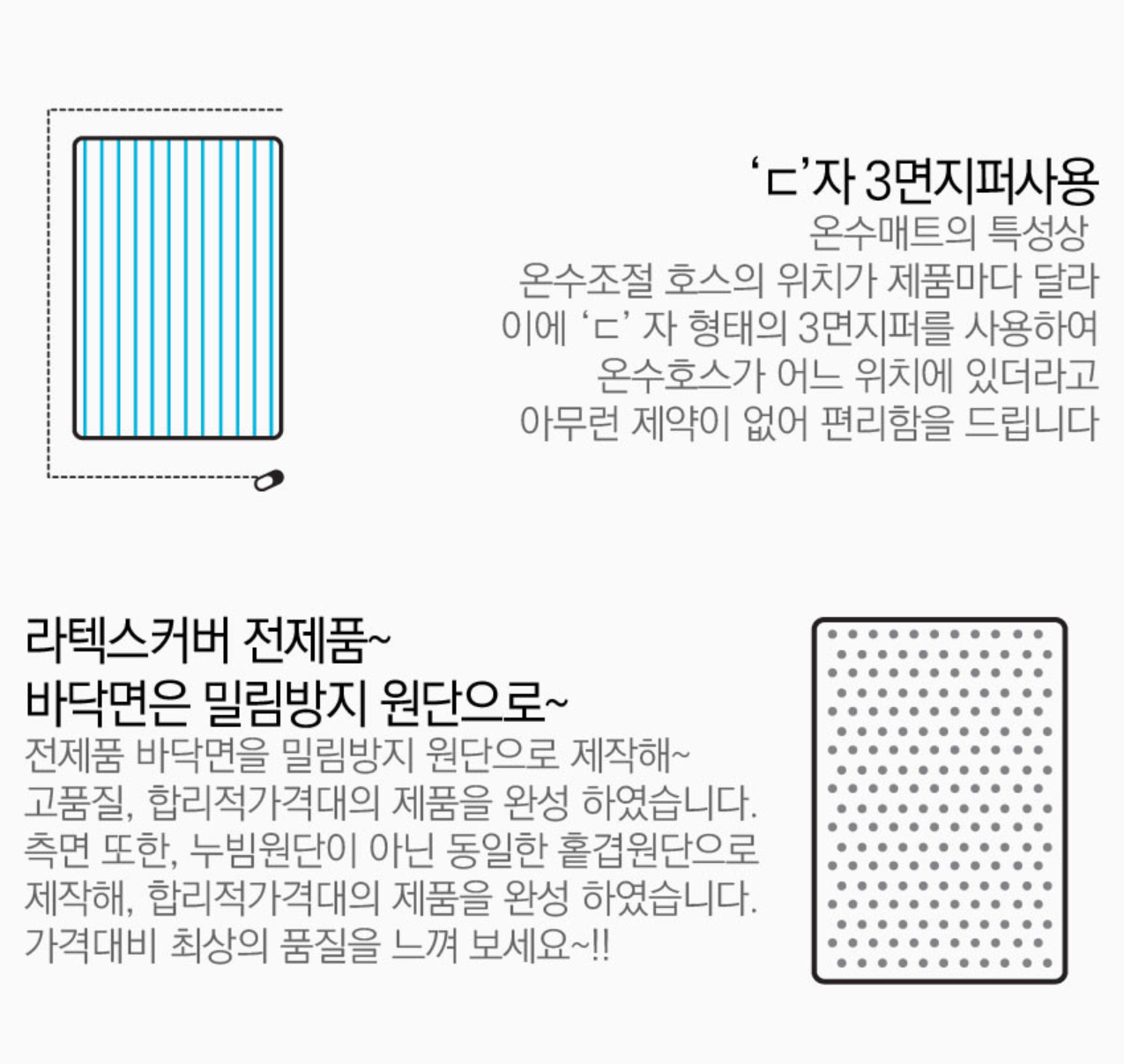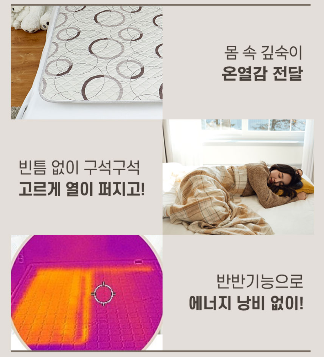온수매트의 가장 큰 장점무엇보다도 '온도 조절'입니다. 사용자에 맞춰 원하는 온도로 설정할 수 있으며, 특히 겨울철의 차가운 바닥에서 따뜻한 수면 환경을 조성해줍니다. 또한, 비교적 균일한 열 분포로 인해 한쪽이 너무 뜨겁거나 차가워지는 일이 없습니다. 에너지를 효율적으로 사용하기 때문에 전기요금 절감에도 도움이 됩니다.