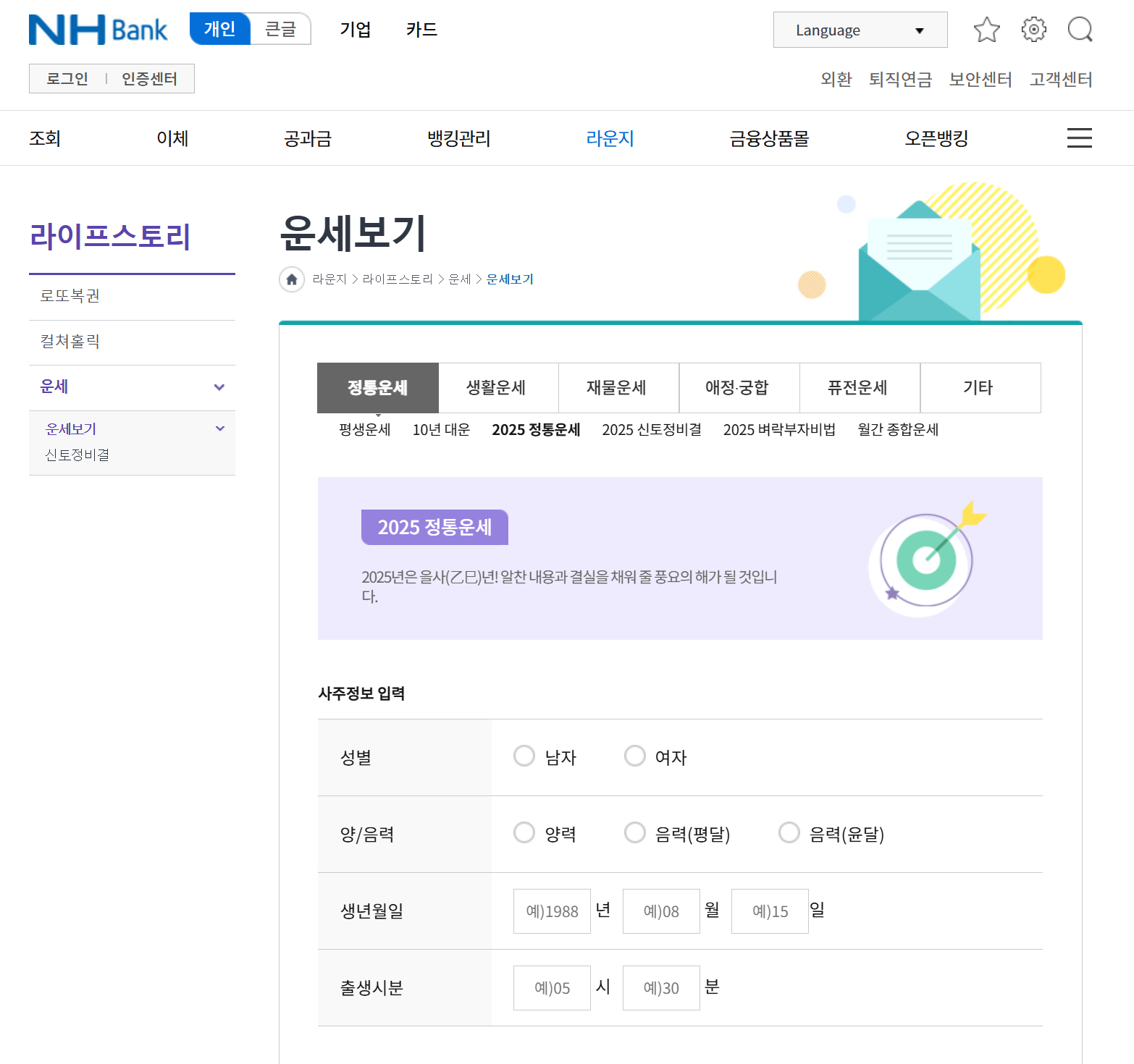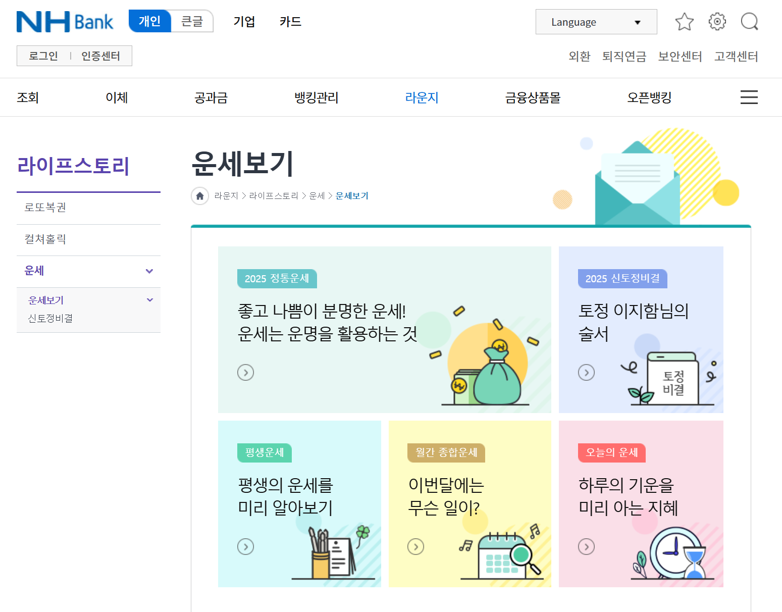 농협에서는 로그인 없이도 무료로 신년운세를 확인할 수 있는 서비스를 제공합니다. 모바일에서는 NH농협 뱅킹 앱을 통해, PC에서는 농협 공식 웹사이트를 통해 이용 가능합니다. 토정비결을 비롯한 다양한 운세 정보를 제공하며, 사용자의 생년월일을 입력하면 개인 맞춤형 운세를 확인할 수 있습니다.