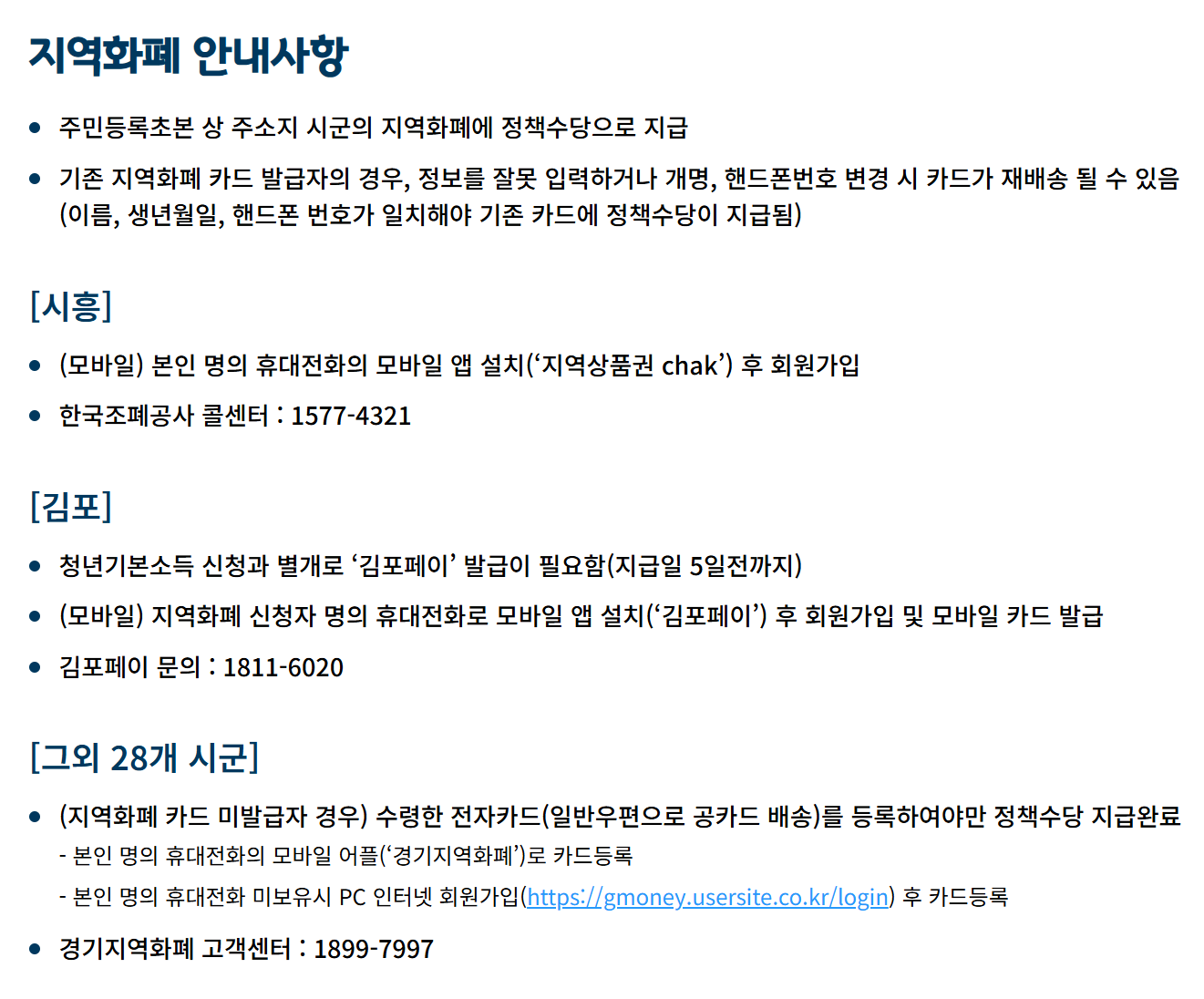 | 지역화폐 카드 | 기존 카드가 있다면 등록, 없으면 신규 발급 필수 |