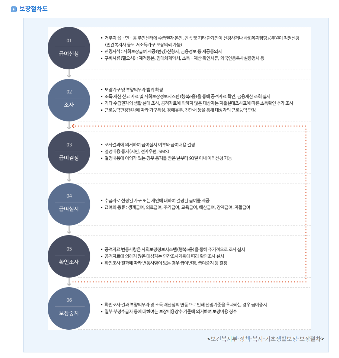 - 지원금 지급 : 자격 인정 시 매월 생계, 의료, 주거, 교육급여 등 지급.