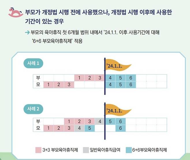 - 자녀 출생 후 1년 이내에 신청 부모가 각각 6개월 육아휴직 가능.